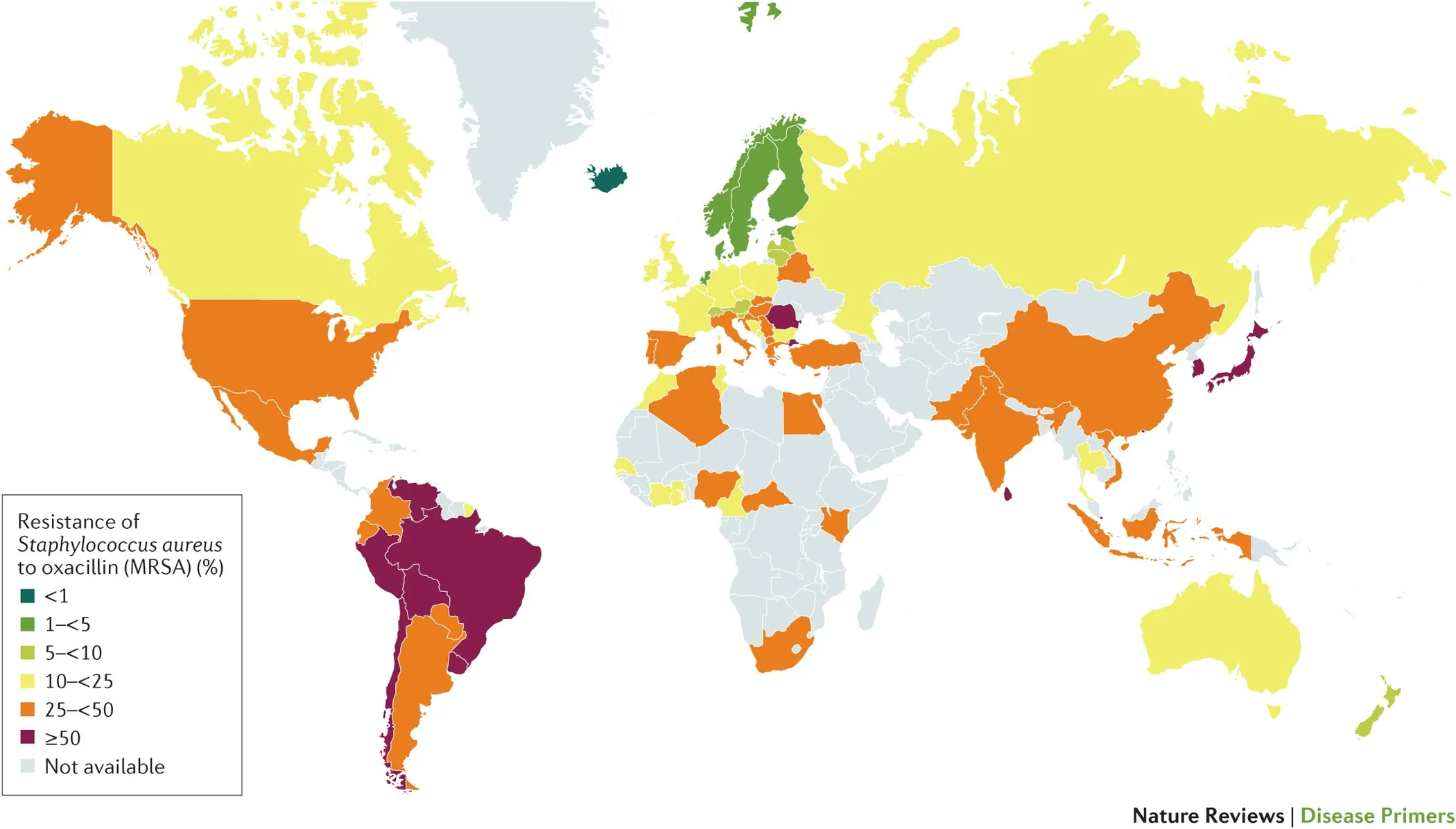 Antibiotikaresistens är ett verkligt problem, kartan ovan visar andel infektioner av stafylokocker som orsakas av resistenta bakterier. Varför skiljer det sig så mycket mellan länder?
